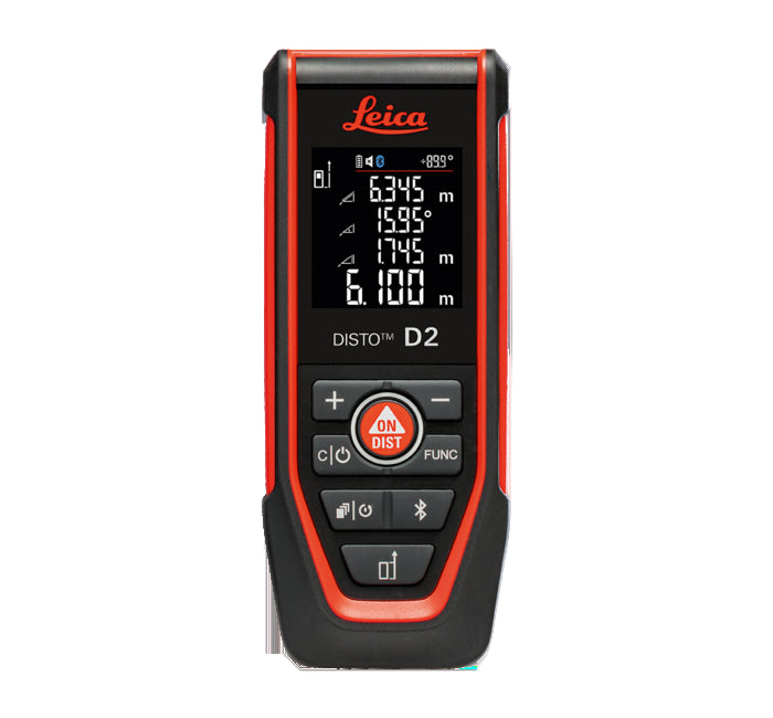 Leica Disto D2 er en avstandsmåler med kompakt design. Avstandsmåleren er i stand til å måle avstander opp til 100 meter med en nøyaktighet på ±1,5 mm. Den har beskyttelsesklasse IP54, noe som betyr at den er i stand til å bli utsatt for tøffe forhold. Denne lasermåleren lagrer opptil 10 målinger i minnet, beregner områder og volumer, samt Pythagoras teorem.